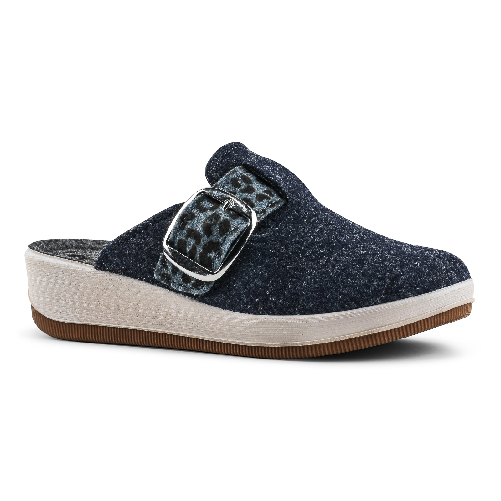 Slipper with wedge and adjustable buckle with animal pattern.