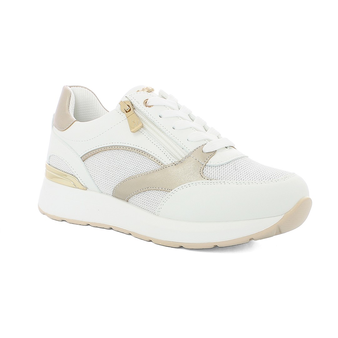 Walking sneakers with a high white sole, featuring a double closure system with both laces and a zipper. a glossy insert above the heel adds a distinctive touch.