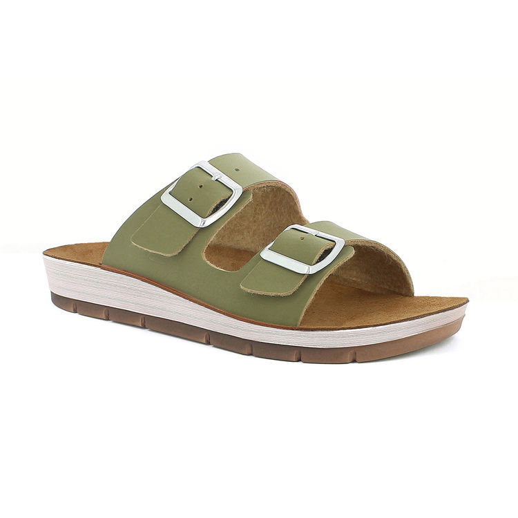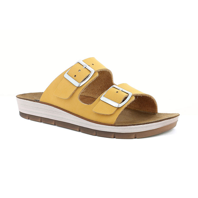Slippers with double straps and adjustable buckles. They have genuine leather footbeds.