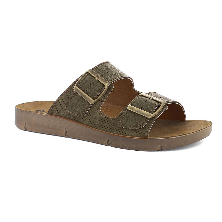 Ciabatte con doppia fascia e fibbia. Modello giovane con plantare in pelle.