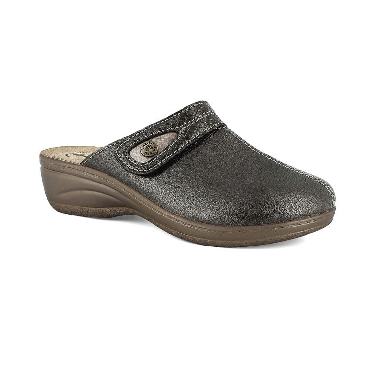 Comfortable slippers with anatomical leather footbed. They have a faux leather finish and strap closure.