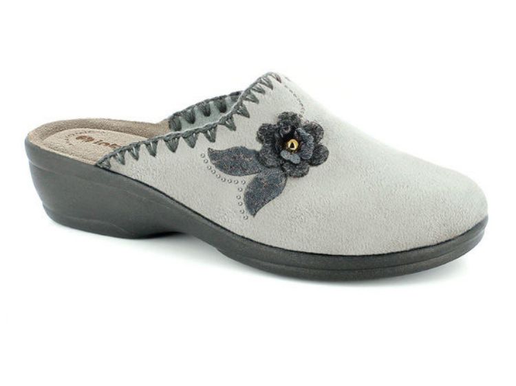 Queste ciabatte sono impreziosite da un fiore applicato e da una bordura ricamata. Per essere eleganti, anche in casa.