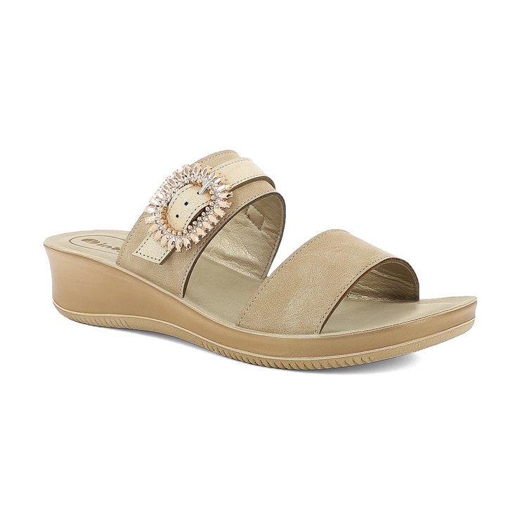 Two-strap slippers with elegant adjustable buckle. with wedge and padded footbed.