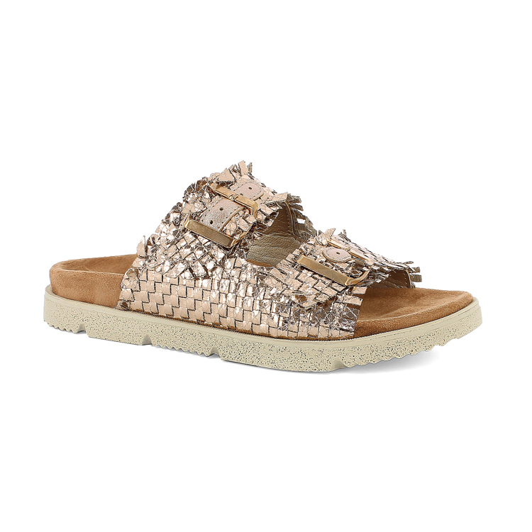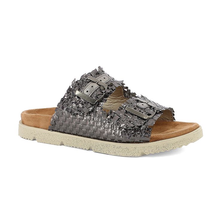 Iridescent-effect double-strap slippers with buckles. they have a comfortable padded fabric footbed.