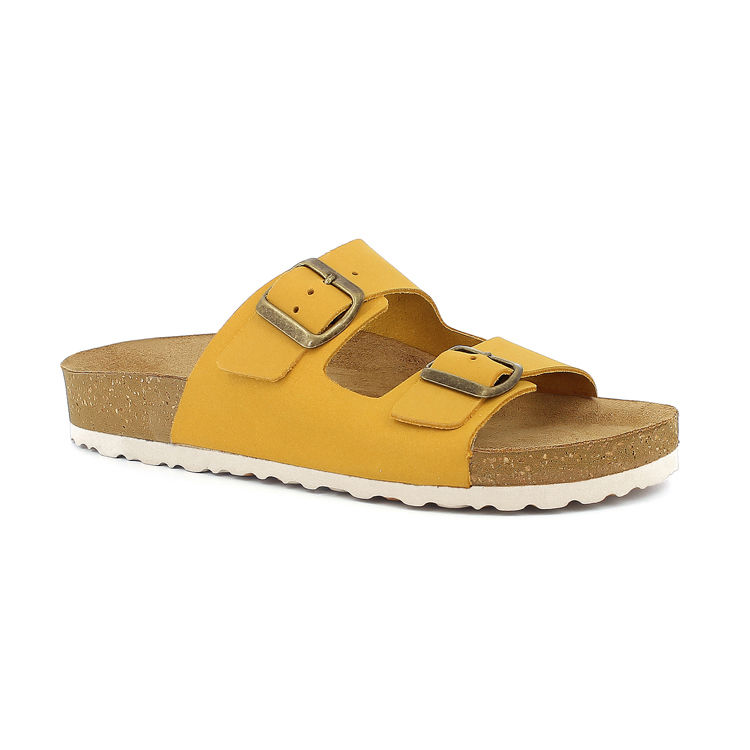 Colorful slippers with double buckle and padded genuine leather footbed.