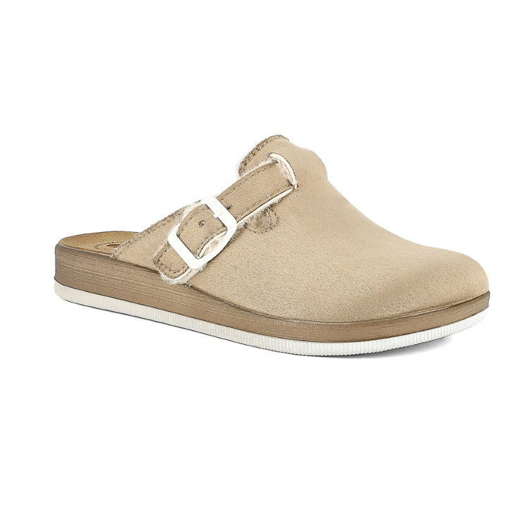 Warm faux fur winter slippers with buckle. They have a comfortable padded leather insole.