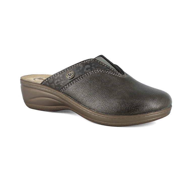 Comfortable slippers with anatomical leather insole. Leather-effect upper with practical elastic and animalier band.
