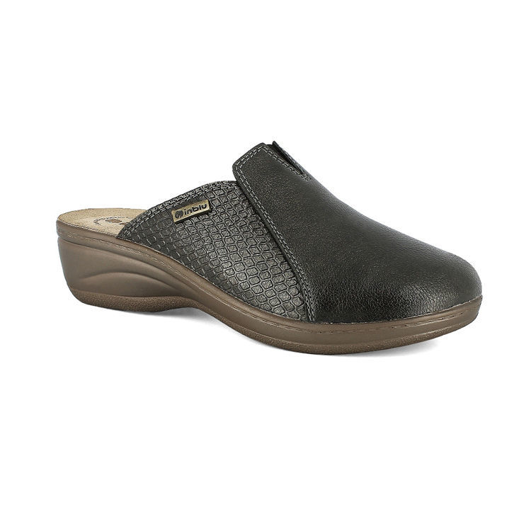 Slippers with anatomical leather insole. Leather effect upper with practical elastic.