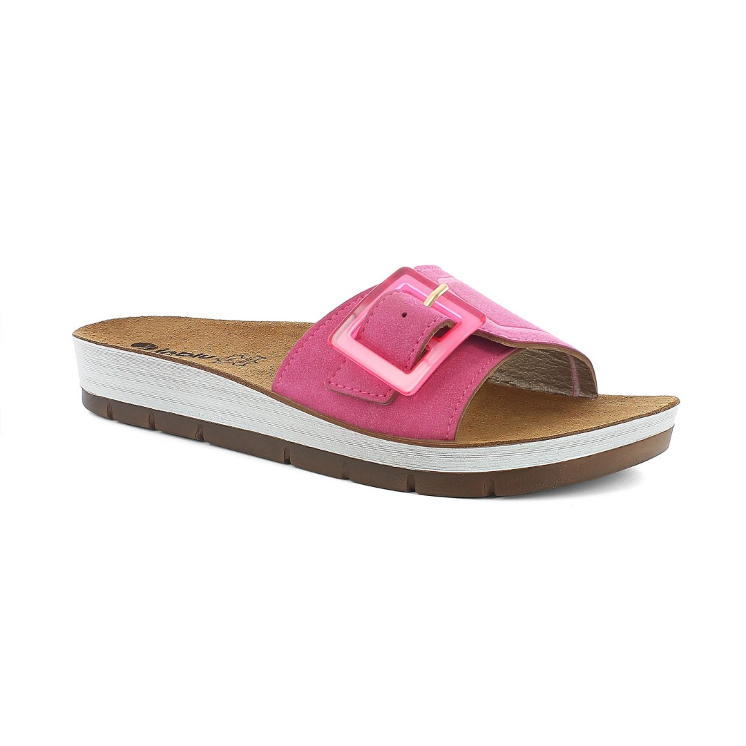 Banded slippers with adjustable square maxi buckle. they have genuine leather footbed.