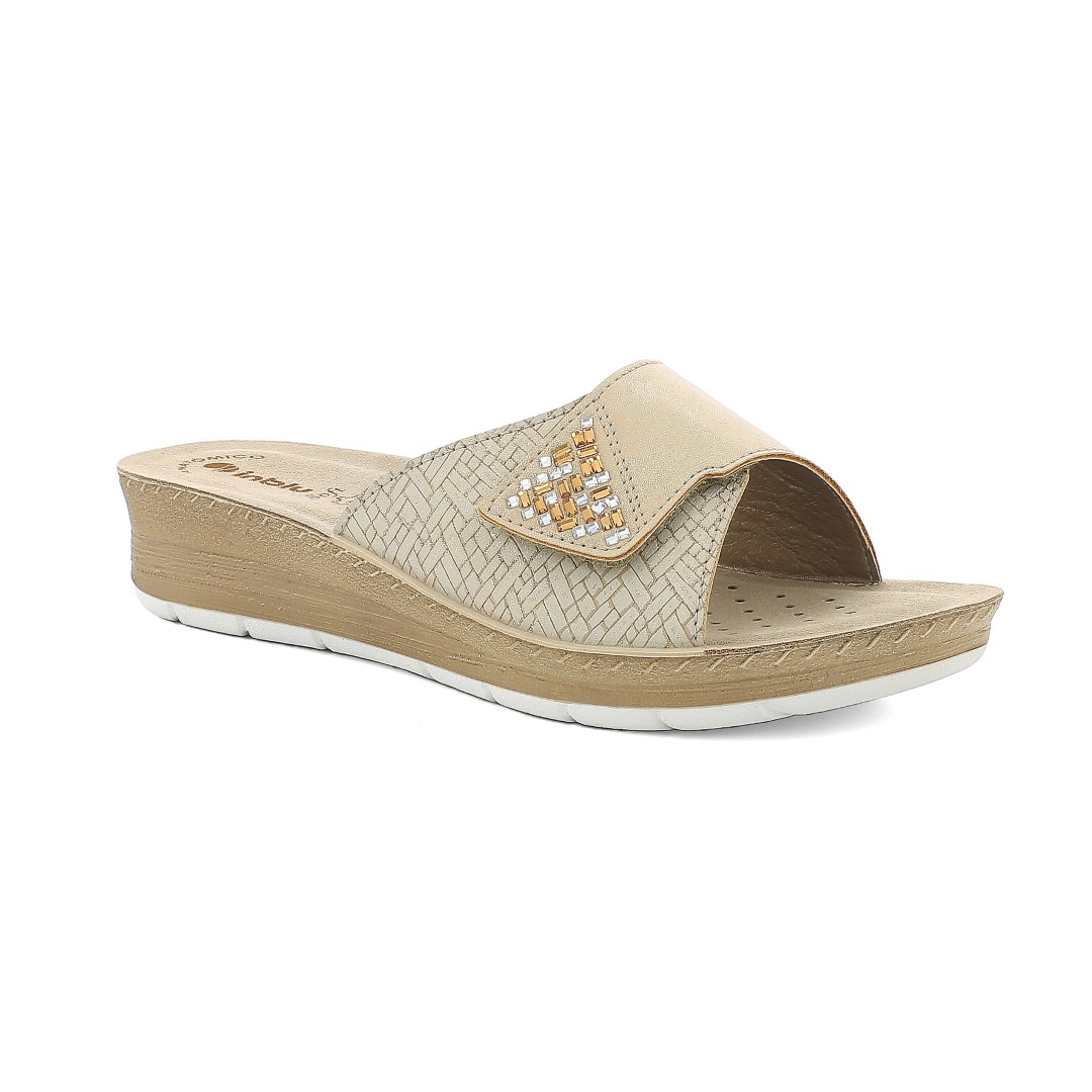 Comfortable flip-flops with rhinestone strap closure. they have a genuine leather footbed.
