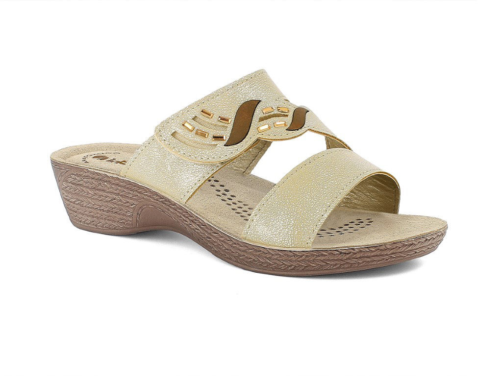 Una ciabatta elegante, con tocchi di luce dati dagli strass e inserti a contrasto.