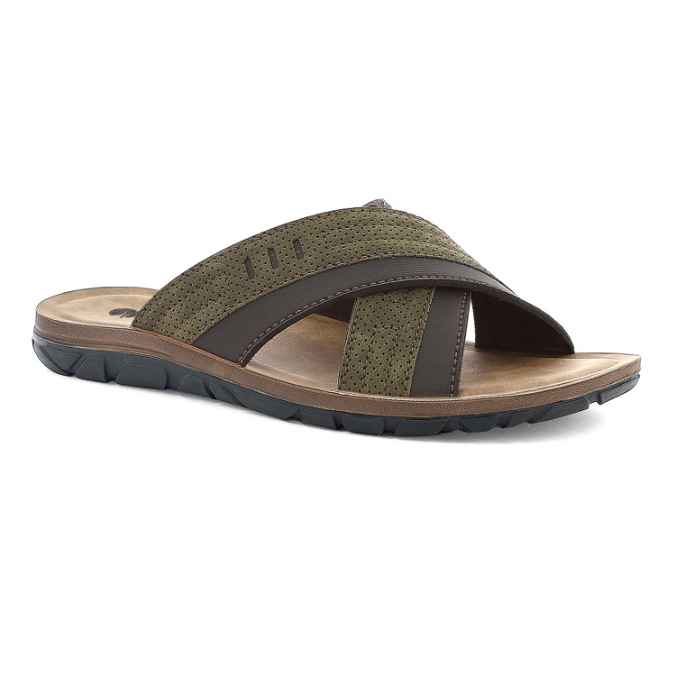 Ciabatte uomo con doppia fascia incociata bicolore. Plantare imbottito in ecopelle.