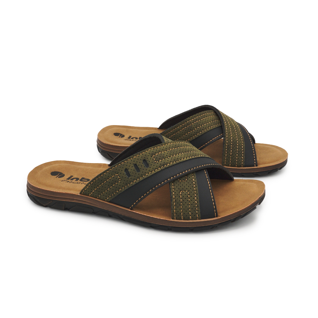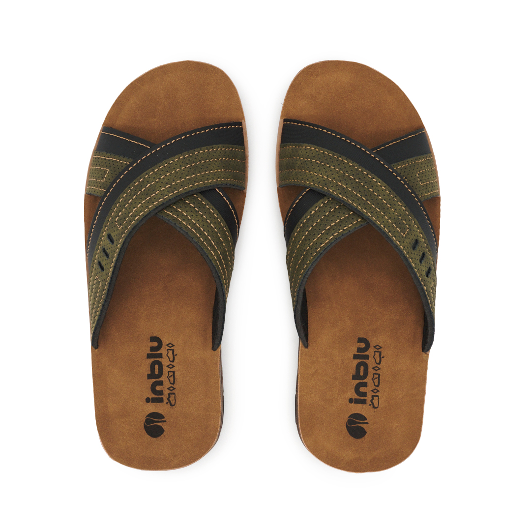 Ciabatte uomo con doppia fascia incociata bicolore. Plantare imbottito in ecopelle.