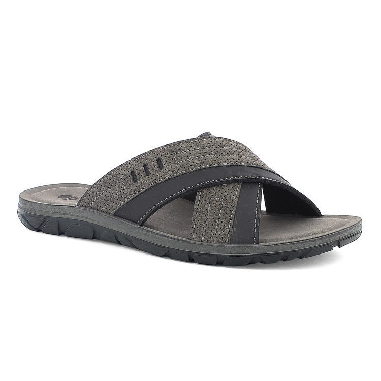 Ciabatte uomo con doppia fascia incociata bicolore. Plantare imbottito in ecopelle.