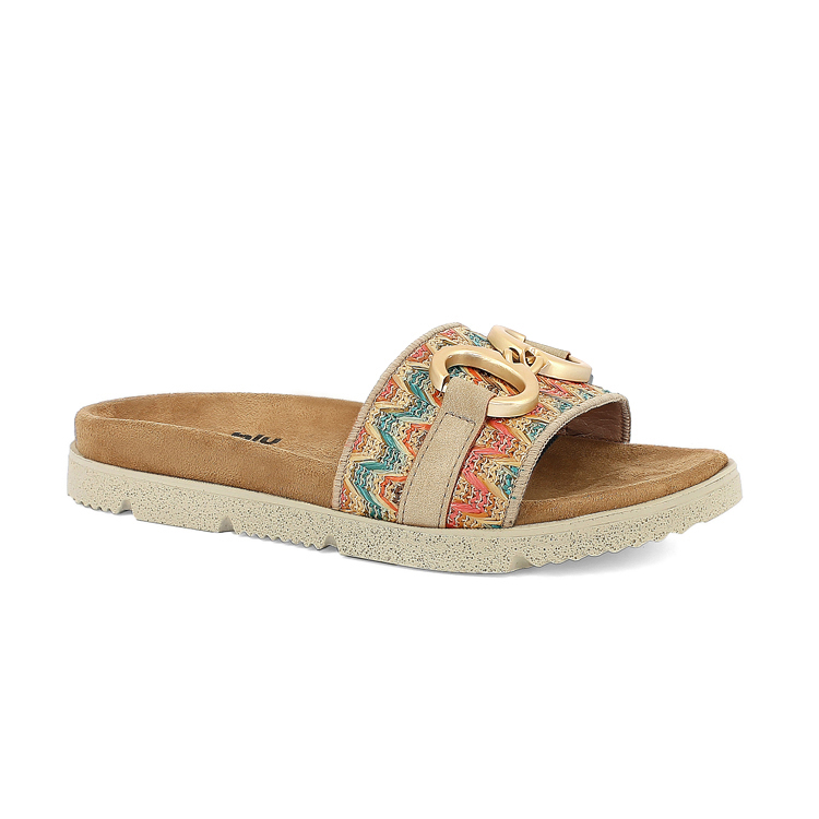 Nuova ciabatta a fascia con fantasia colorata multicolore e accessorio a catena. Hanno una suola in tessuto imbottito.Originali, resistenti e comodissime.