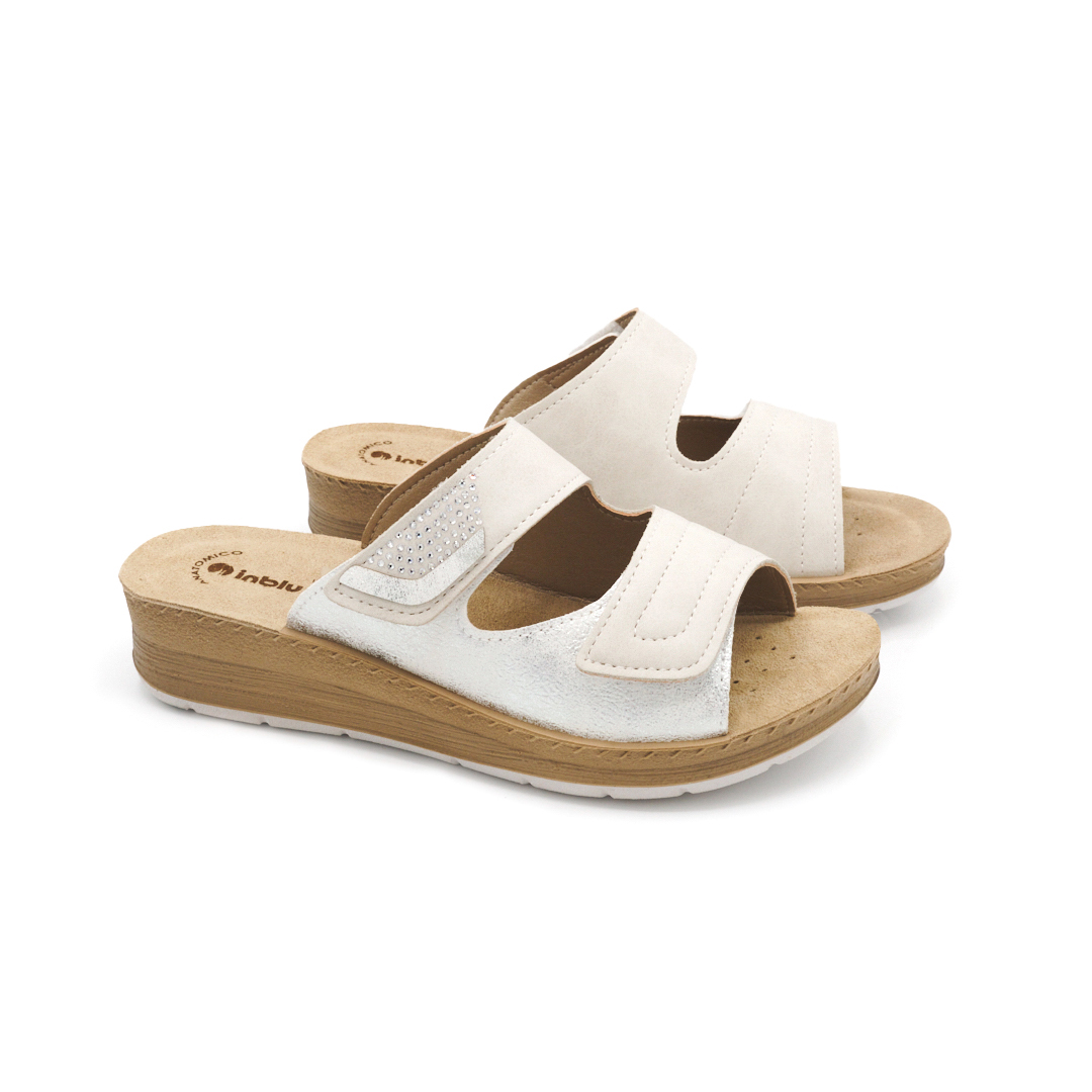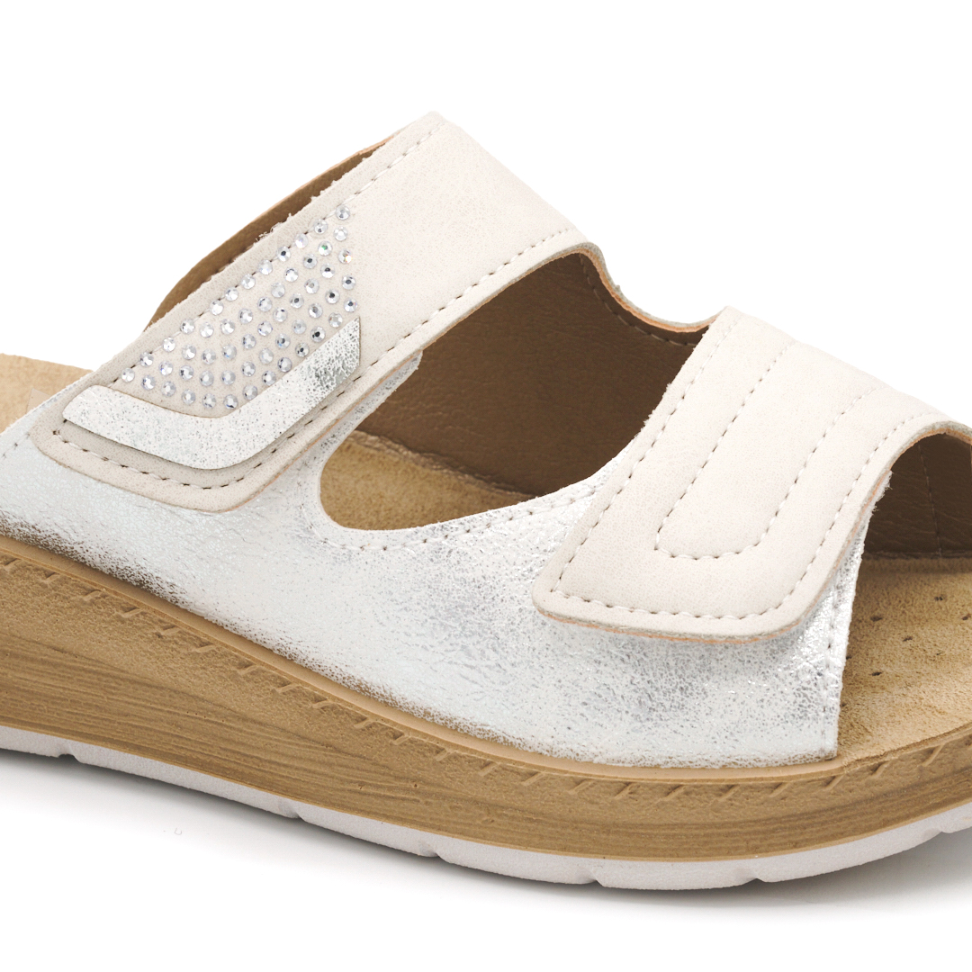 Queste ciabatte hanno un leggero tacco posteriore di quattro centimetri mentre la calzata con doppia chiusura a strappo rende l'indosso perfetto. La fascia superiore è decorata con deliziosi brilllantini per darti uno stile unico e inconfondibile.