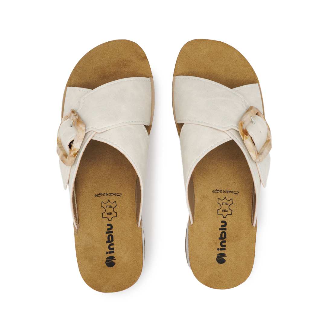 Ciabatte con zeppa di quattro centimetri. Hanno un'originale fibbia quadrata.