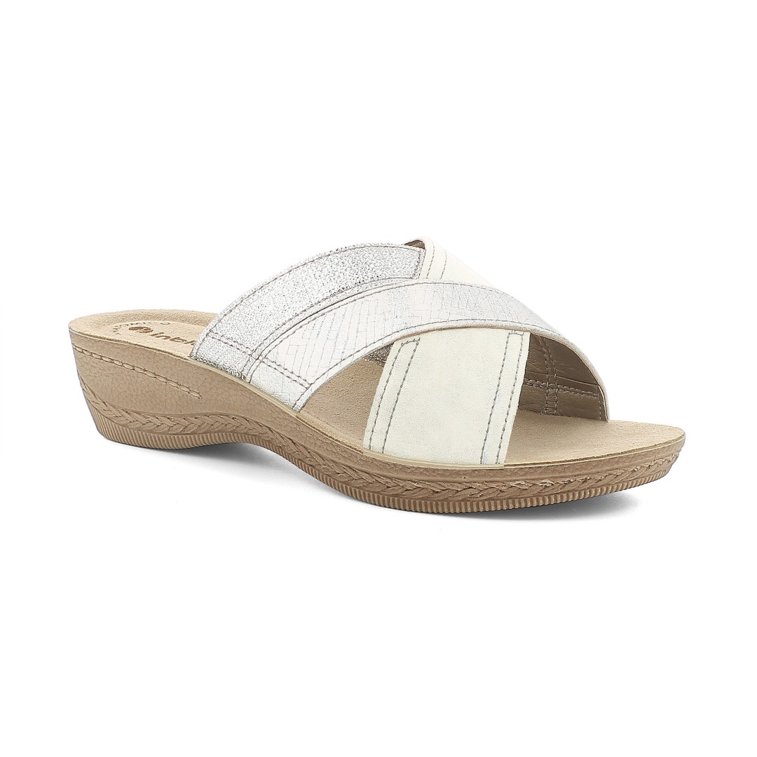 Queste ciabatte hanno una tomaia composta da fasce incrociate che alternano colori pieni a fantasia di design. Sono progettate per avvolgere il piede in modo confortevole.Il plantare anatomico in pelle permette una sensazione di comfort prolungato, mentre il tacco di 4,5 cm e il plateau di 2 permettono una camminata piacevole senza affaticarti.