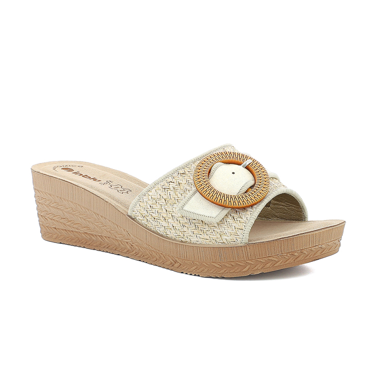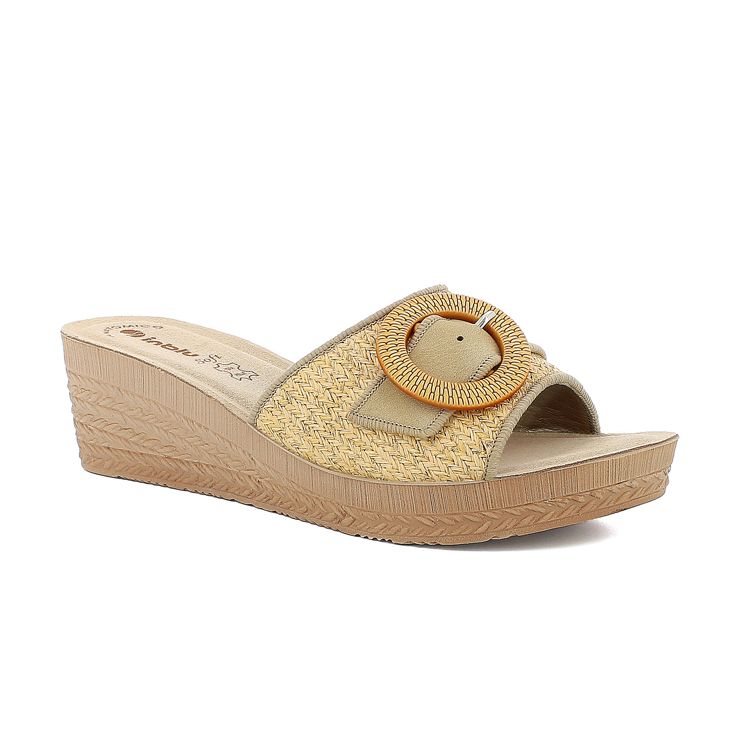 Nuove ciabatte con zeppa, rese comodissime grazie al plantare in vera pelle imbottito.La suola è leggerissima, mentre la particolare fibbia tonda le rende adattabile ad ogni collo del piede.