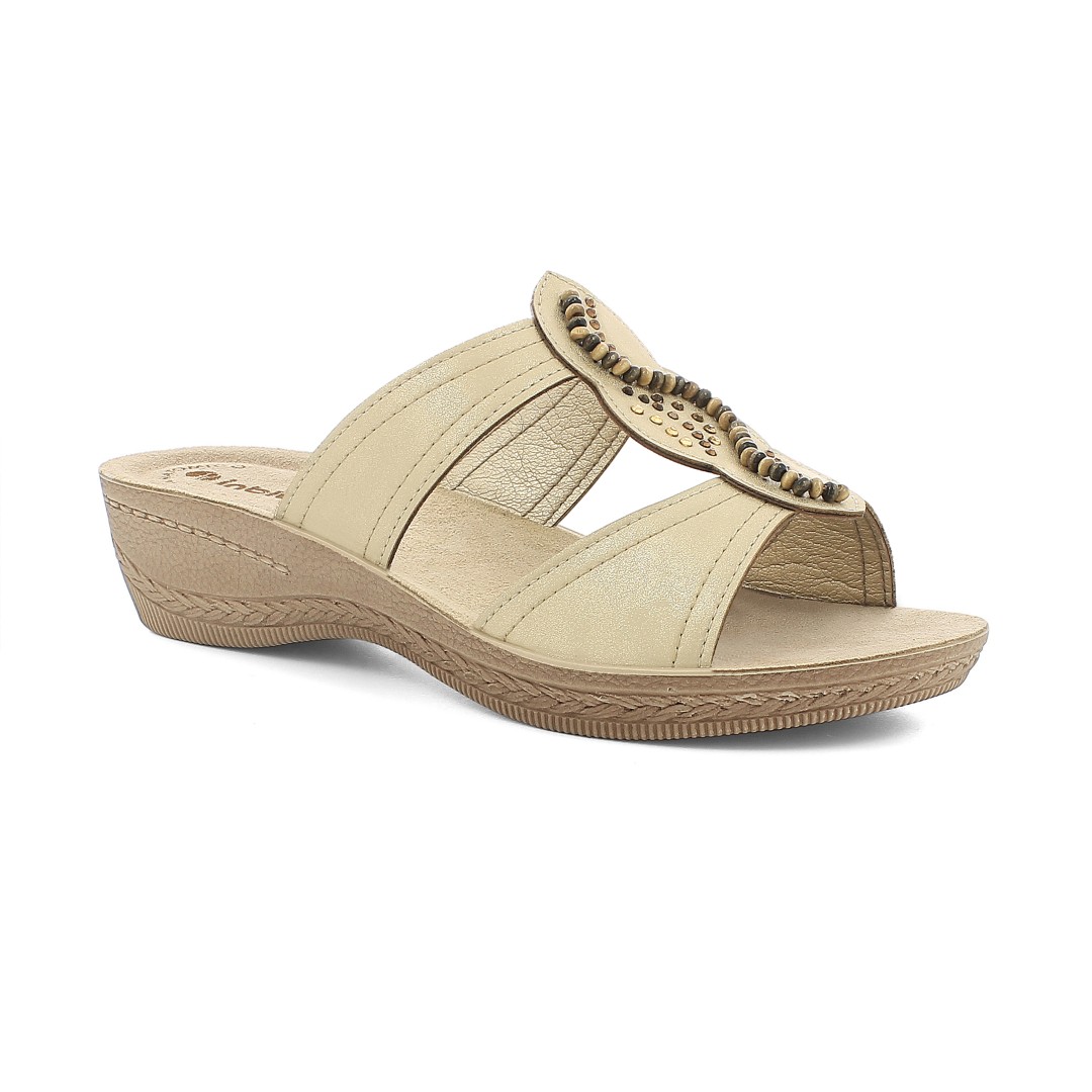 Ciabatte a fasce incrociate che avvolgono il piede. La tomaia è arricchita da un inserto decorativo centrale, caratterizzato da piccole applicazioni che aggiungono luminosità e valorizzano il design, creando un punto focale elegante e raffinato.Il plantare è morbido e anatomico, studiato per seguire la naturale conformazione del piede e garantire una sensazione di benessere prolungato. La suola leggera con zeppa assicura un appoggio confortevole e una camminata piacevole, ideale per le attività di tutti i giorni.