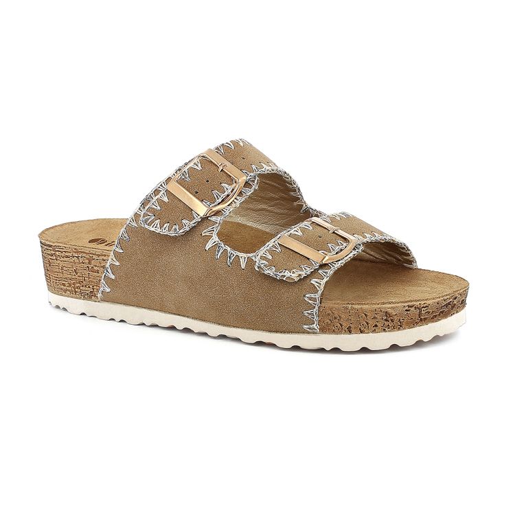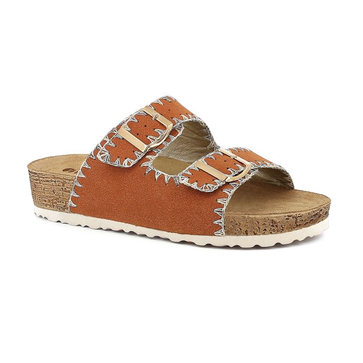 Ciabatte a doppia fascia con bordo cucito e fibbie regolabili. Plantare in vera pelle.