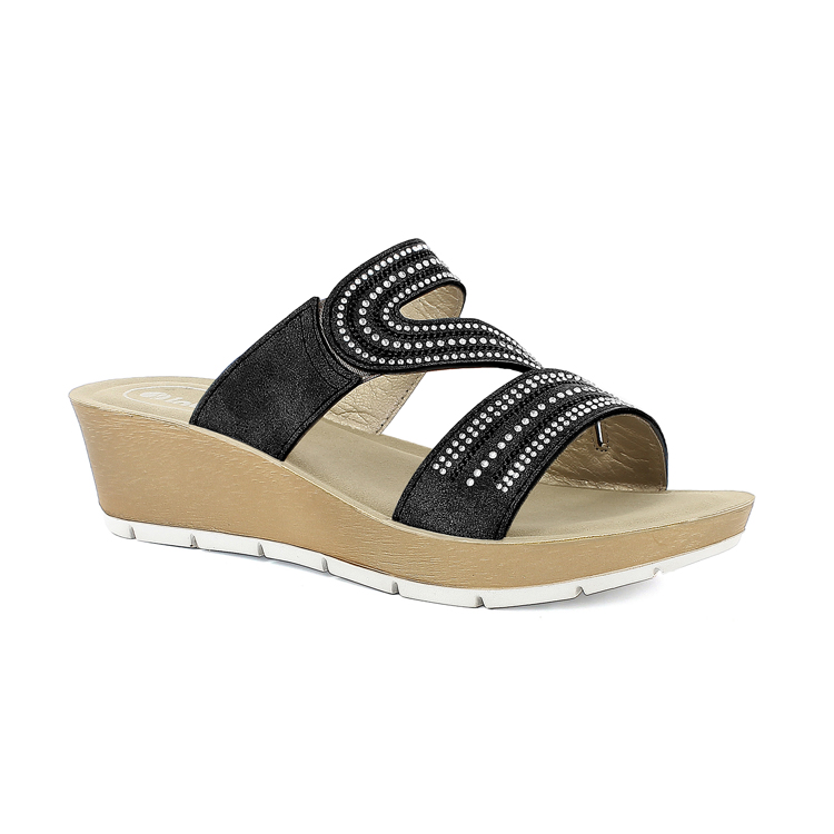 Ciabatte a doppia fascia con strass e morbido plantare imbottito. Tacco di cinque centimetri.