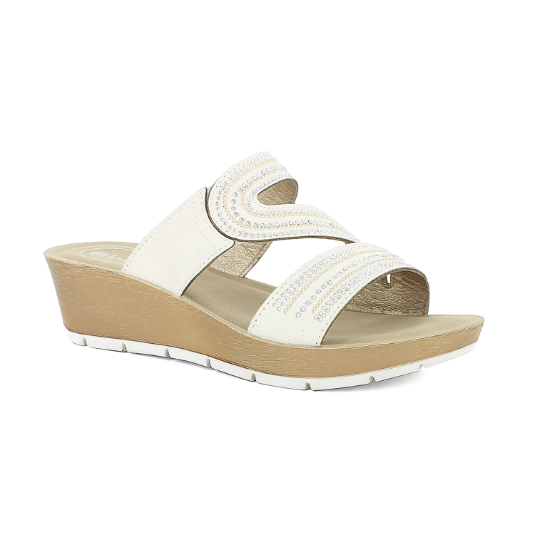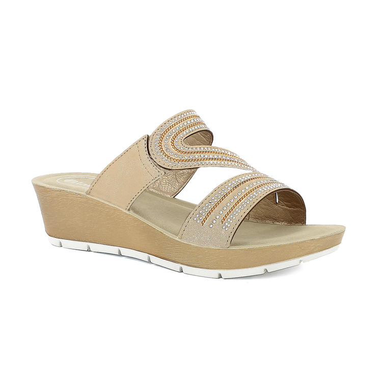 Ciabatte con tacco di cinque centimetri e tomaia a doppia fascia unita con particolare design a s ricoperto di strass. Un discreto inserto elastico fa sì che questa calzatura si adatti ad ogni collo del piede.La suola comoda e la luminosità di questa ciabatta ti conquisteranno!