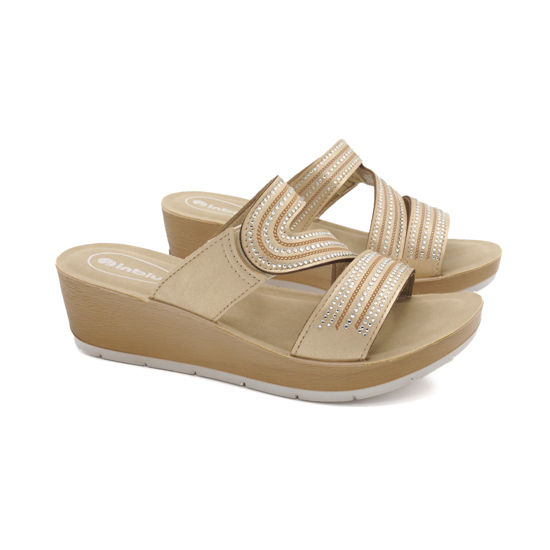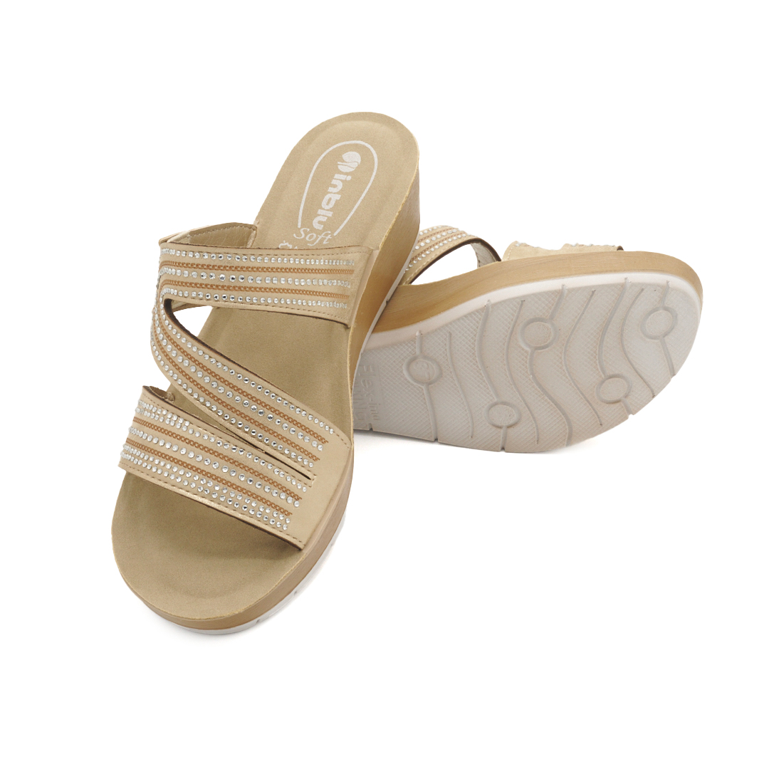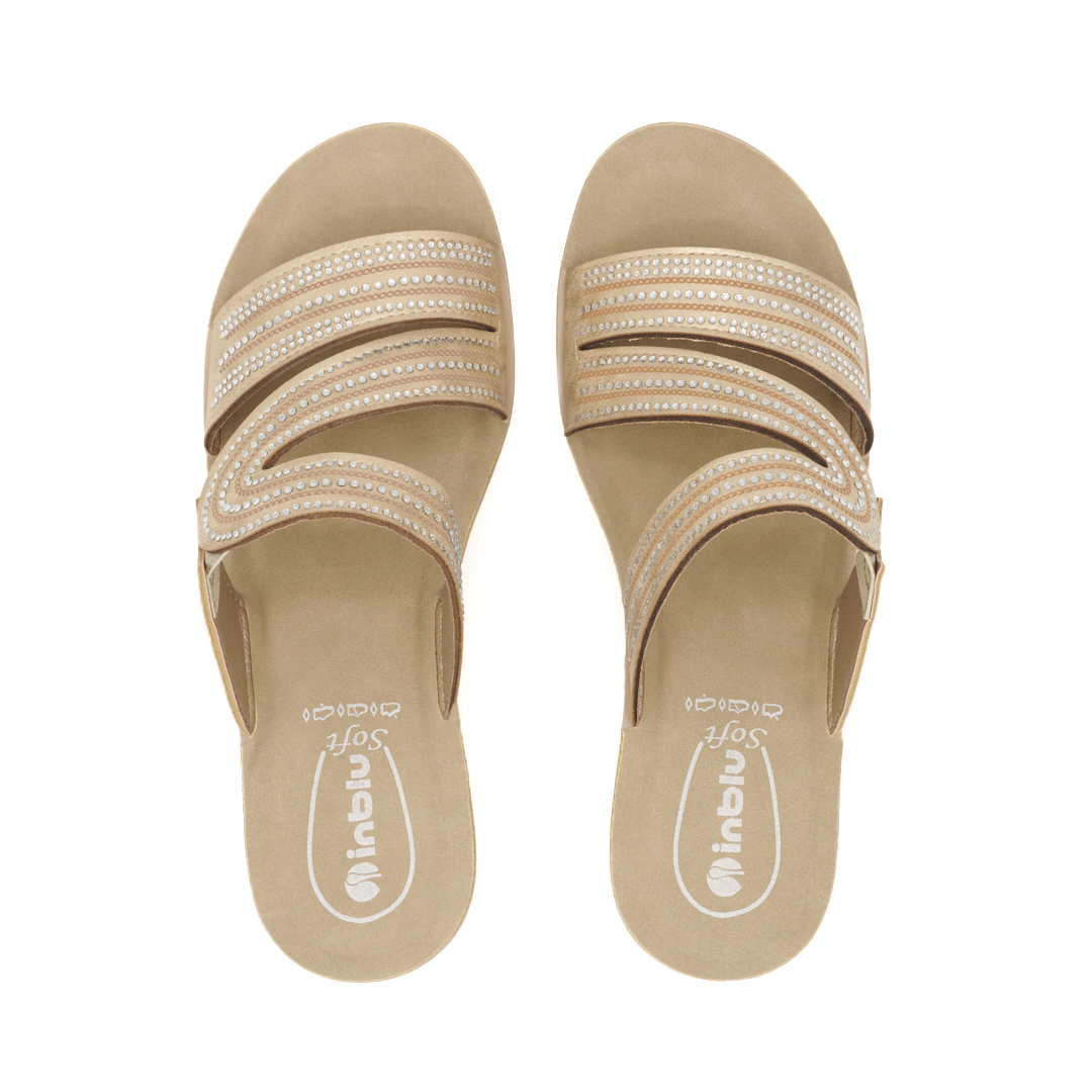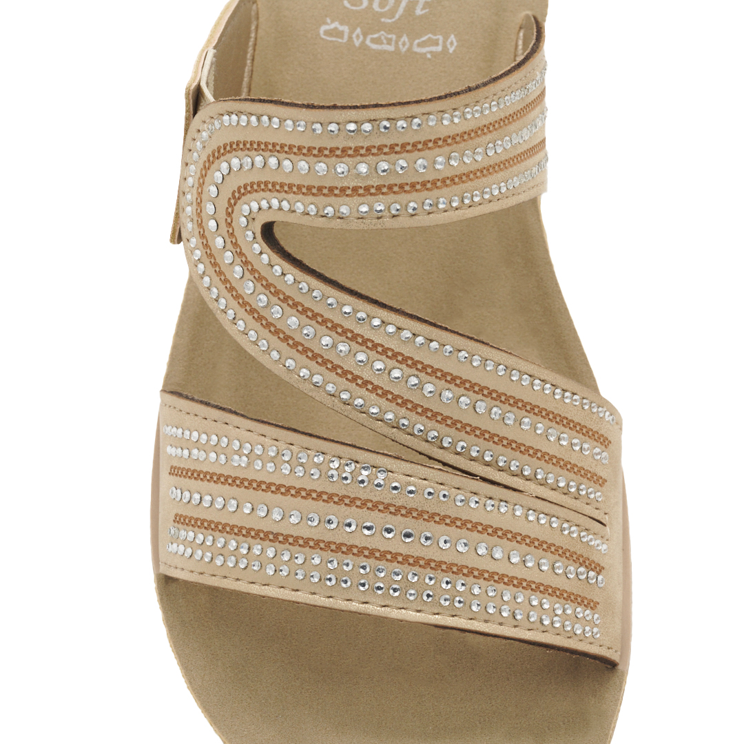 Ciabatte a doppia fascia con strass e morbido plantare imbottito. Tacco di cinque centimetri.