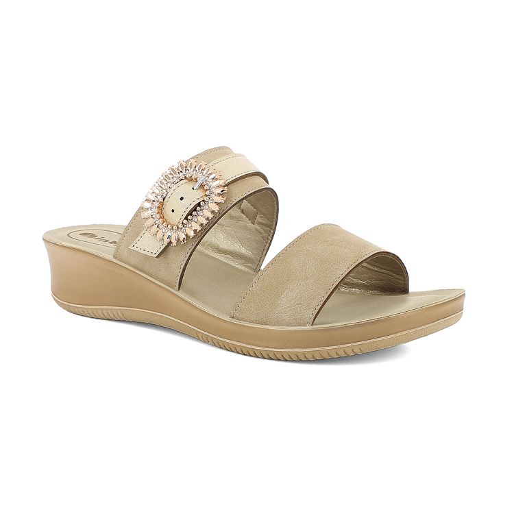 Ciabatte a due fasce con fibbia regolabile elegante. Con zeppa e plantare imbottito.