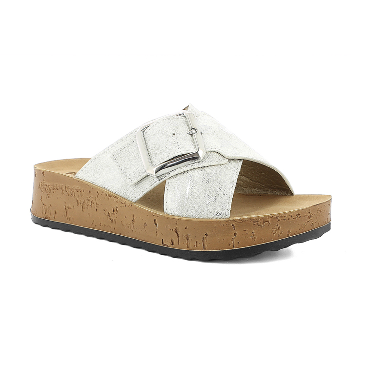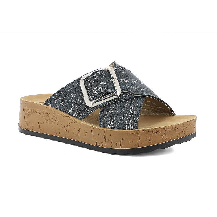 Ciabatte con effetto pennellata a doppia fascia incrociata con fibbia. Plantare imbottito in ecopelle.