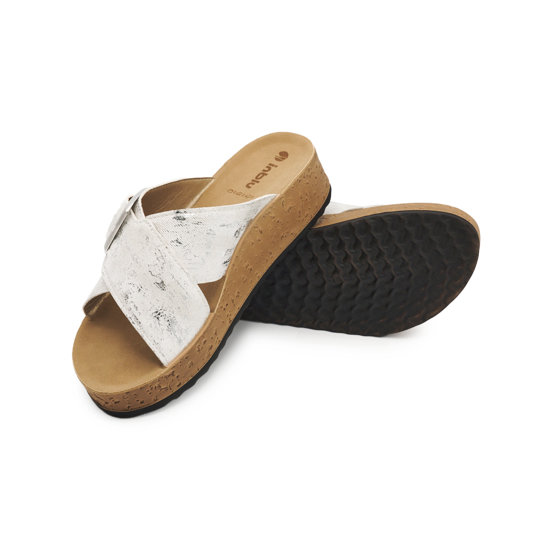 Ciabatte con effetto pennellata a doppia fascia incrociata con fibbia. Plantare imbottito in ecopelle.