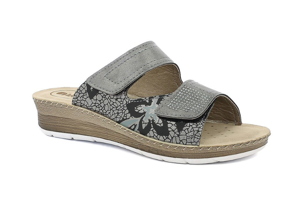 plantare imbottito e suola leggerissima grazie al materiale poliuretanico. Calzata comoda. I punti luce e la fantasia argentata donano a questa ciabatta un tocco di eleganza.