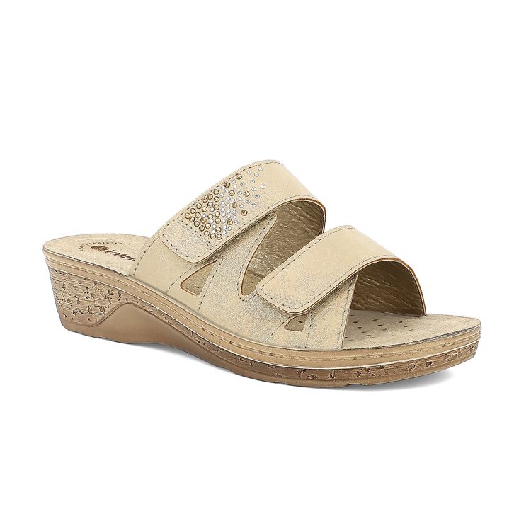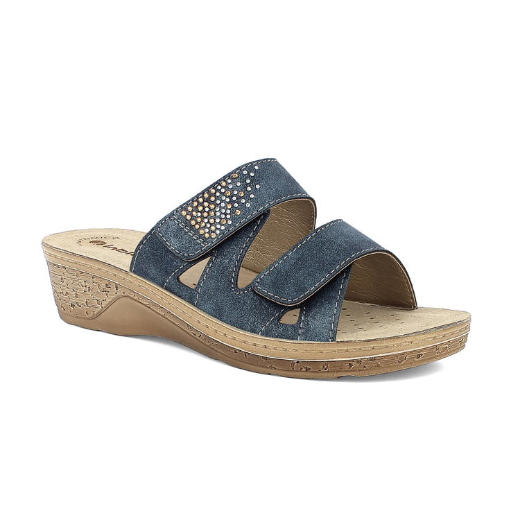 Queste ciabatte sono pensate per il tuo benessere: il loro plantare in vera pelle imbottita si unisce a un leggero tacco di quattro centrimentri, addolcito da un plateau di due.La chiusura a doppia fascia in velcro è comodissima e impreziosita da un decoro a triangolo in strass per dondarti un tocco sempre distinto. Che volere di più?