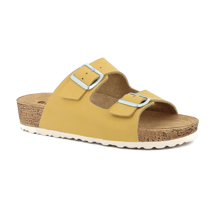 Ciabatte con doppia fascia e fibbia regolabile. Plantare in vera pelle.