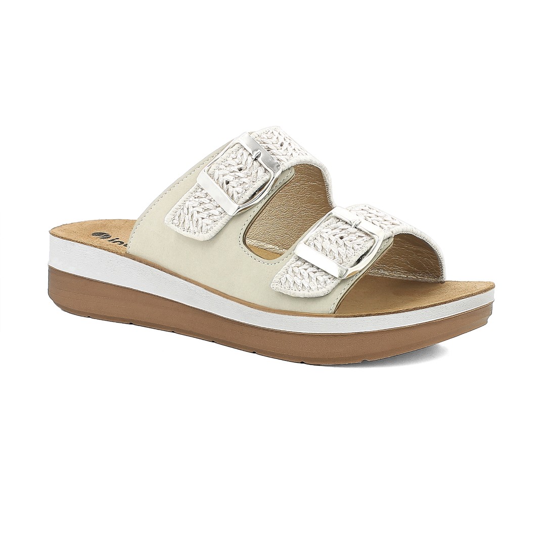 Nuove ciabatte con doppia fascia in rafia metallizzata dotate di fibbie regolabili. Si adattano facilmente al piede e offrono praticità durante l'uso quotidiano.Il morbido plantare in vera pelle si unisce ad una suola bicolore con rialzo di quattro centimetri che dona slancio senza essere eccessiva.