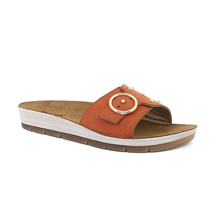 Ciabatte con originale fibbia tonda e borchie dorate. Hanno un plantare in vera pelle imbottito.
