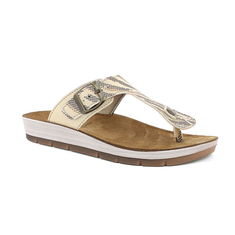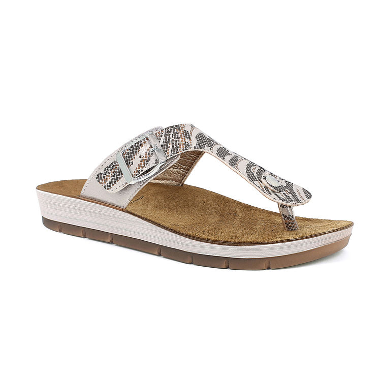 Infradito con stampa e fibbia regolabile. Plantare in vera pelle imbottita.