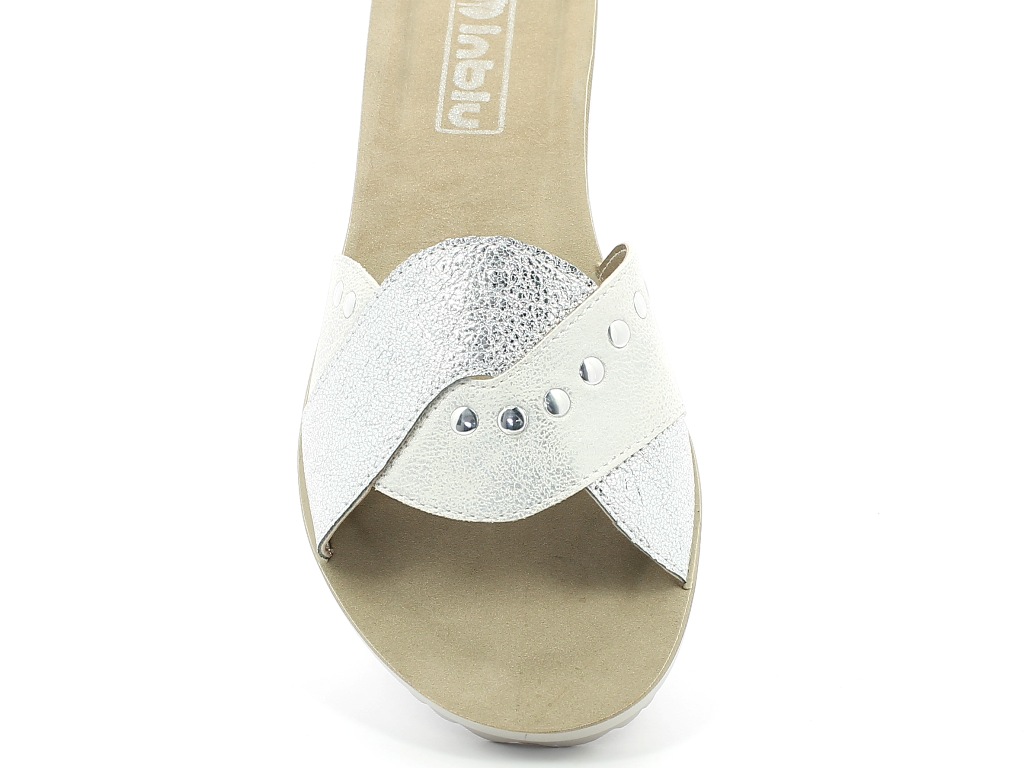 Suola leggerissima e plantare in morbida ecopelle imbottita. L'incrocio di due materiali luminosi è valorizzato dalle piccole borchie tonde laterali, che impreziosiscono il pezzo.