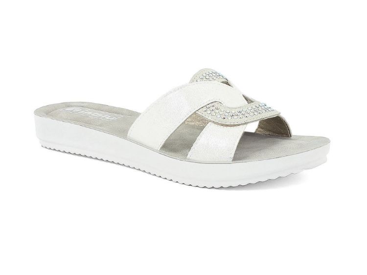 Suola leggerissima e plantare in morbida ecopelle imbottita. L'incrocio di due materiali luminosi è valorizzato dai brillantini, che impreziosiscono il modello.