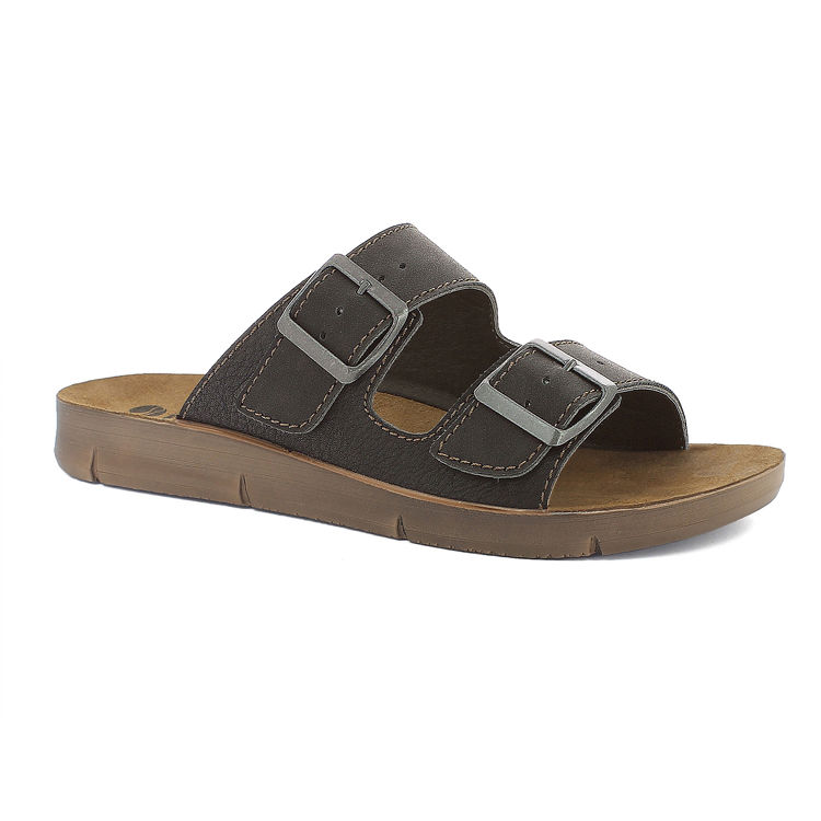 Ciabatte con doppia fascia e fibbia. Modello giovane con plantare in pelle.