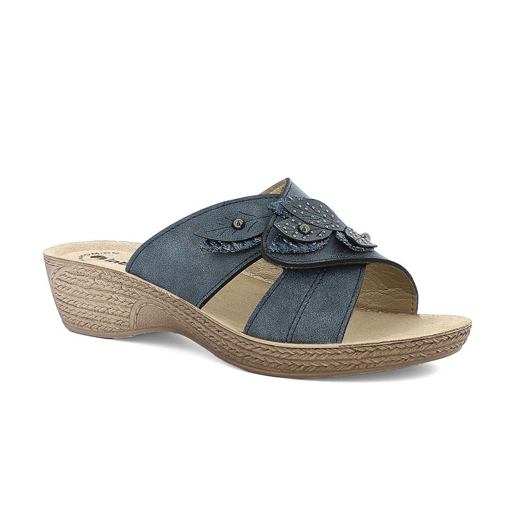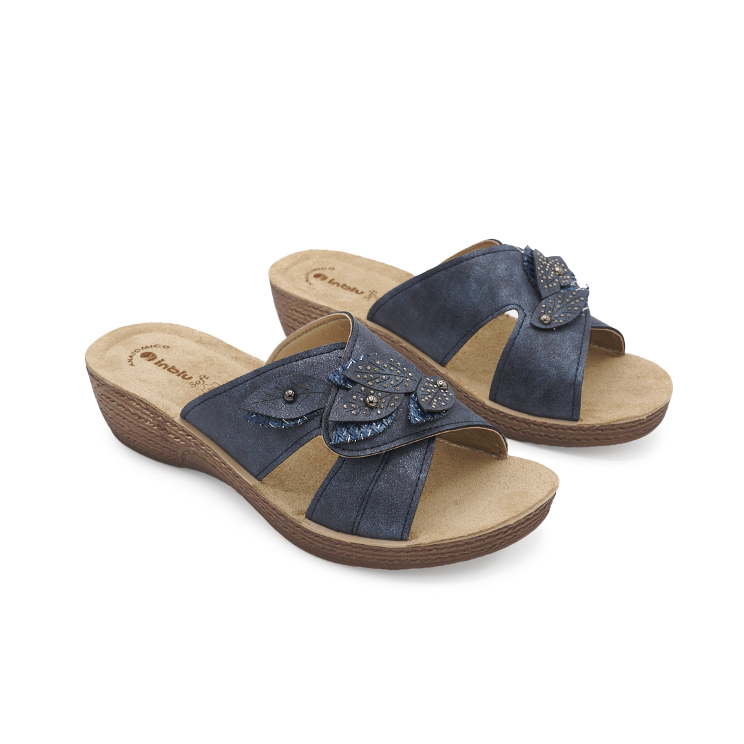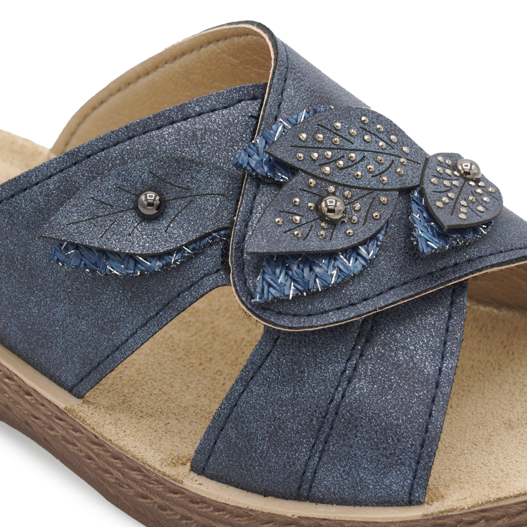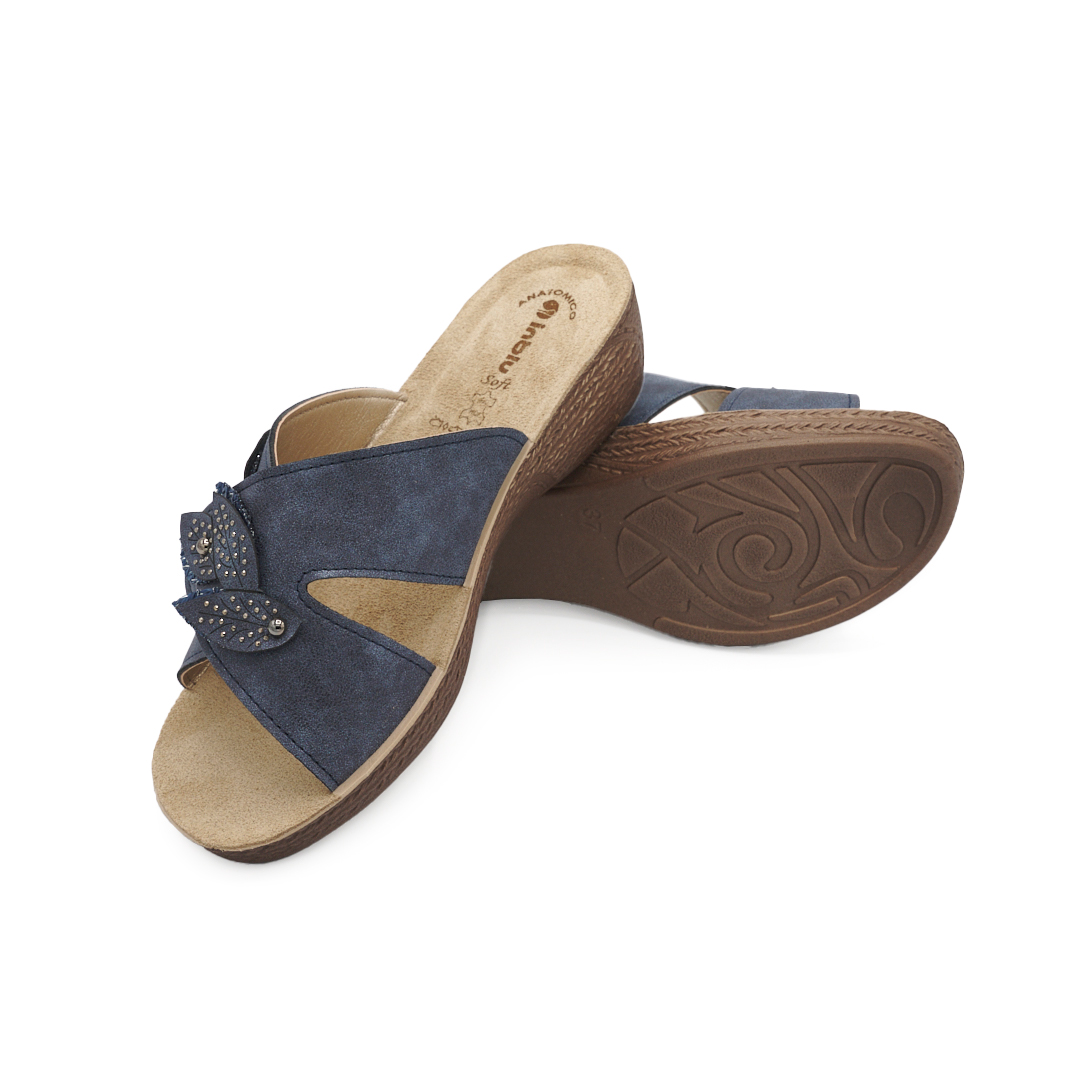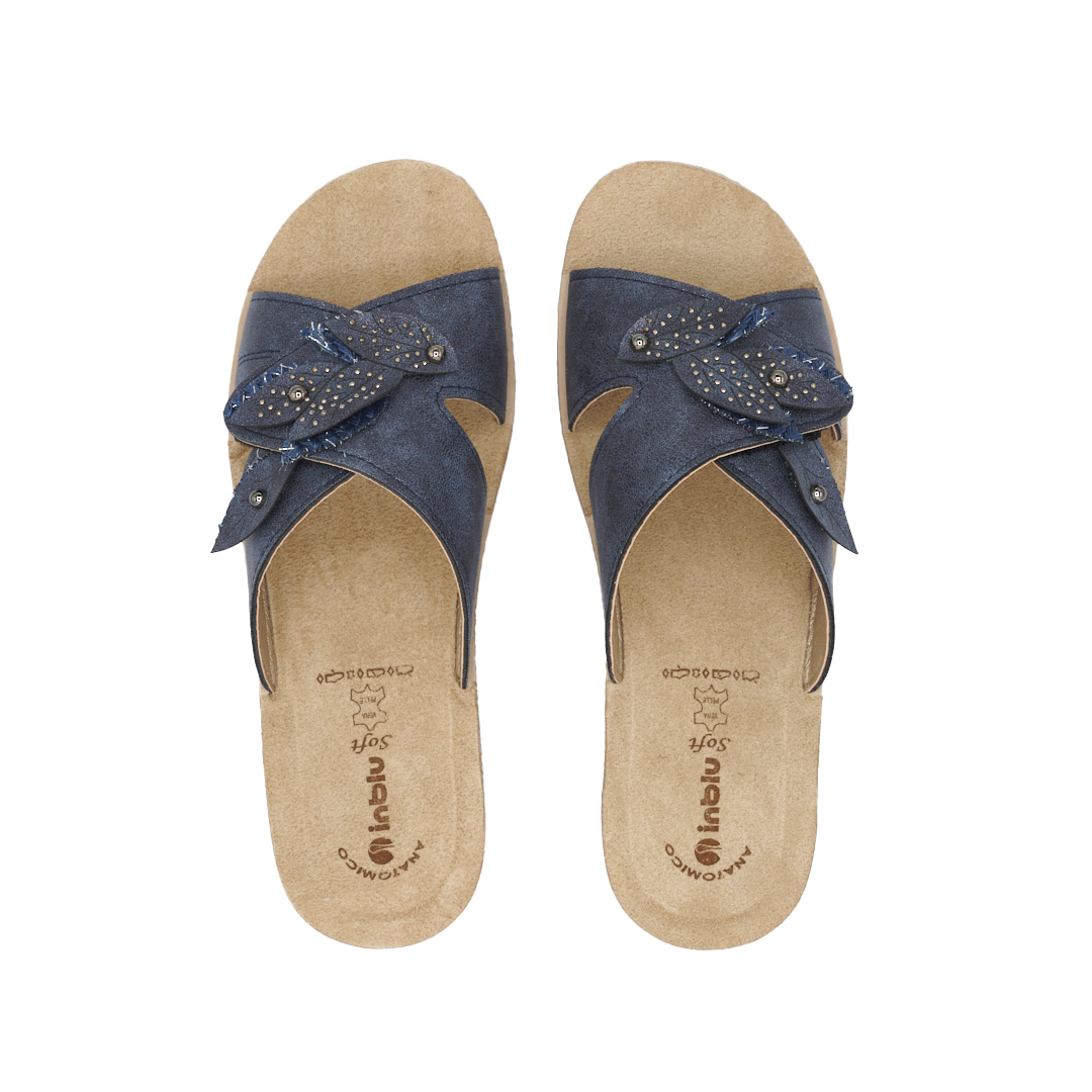 La leggerezza del tacco evita inutili affaticamenti, mentre la chiusura a strappo è discretamente coperta da un elegante decoro a foglia.Porta le tue inblu sempre con te, per avere a portata di piede una calzatura sempre comoda, grazie al plantare imbottito in vera pelle.