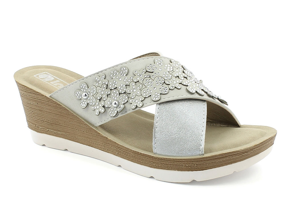 Il dislivello compensato dal plateau rende la camminata un piacere: la schiena è in una posizione naturale e lo stress è attenuato. Ciabatta con doppia fascia incrociata per una calzata avvolgente e quindi salda. La fascia superiore è arricchita da splendidi fiori con piccoli brillantini.
