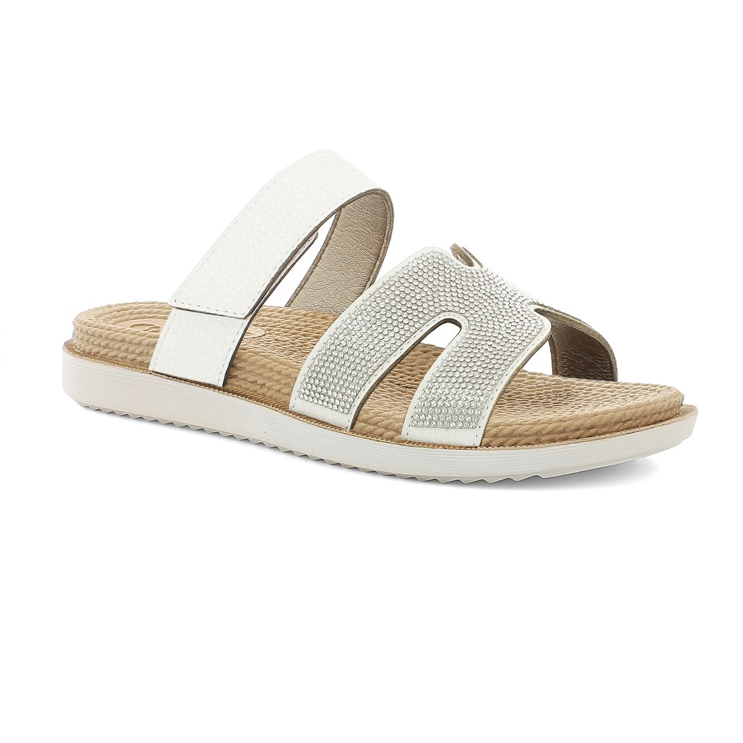 Ciabatte doppia fascia con fascia a strappo e tomaia brillantinata. La suola è Dual Density: morbida dentro e resistente fuori.