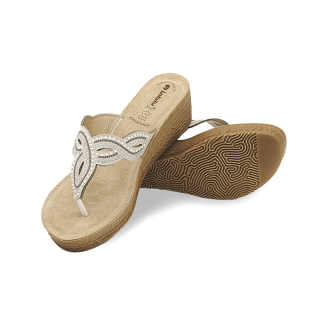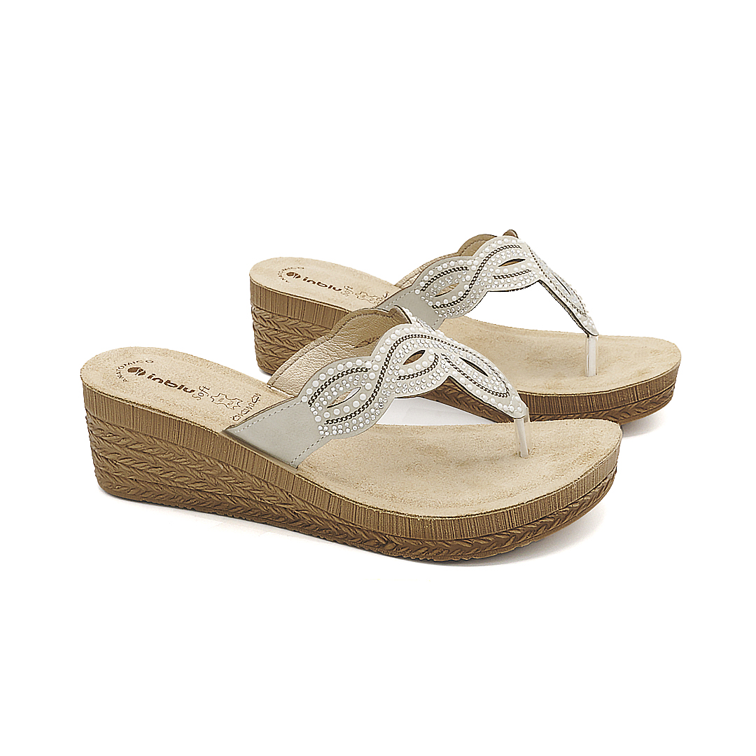 Eleganti infradito con zeppa e leggero plateu, impreziosite da strass. Plantare in vera pelle.