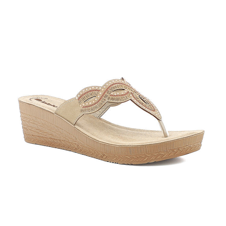 Eleganti infradito con zeppa e leggero plateu, impreziosite da strass. Plantare in vera pelle.