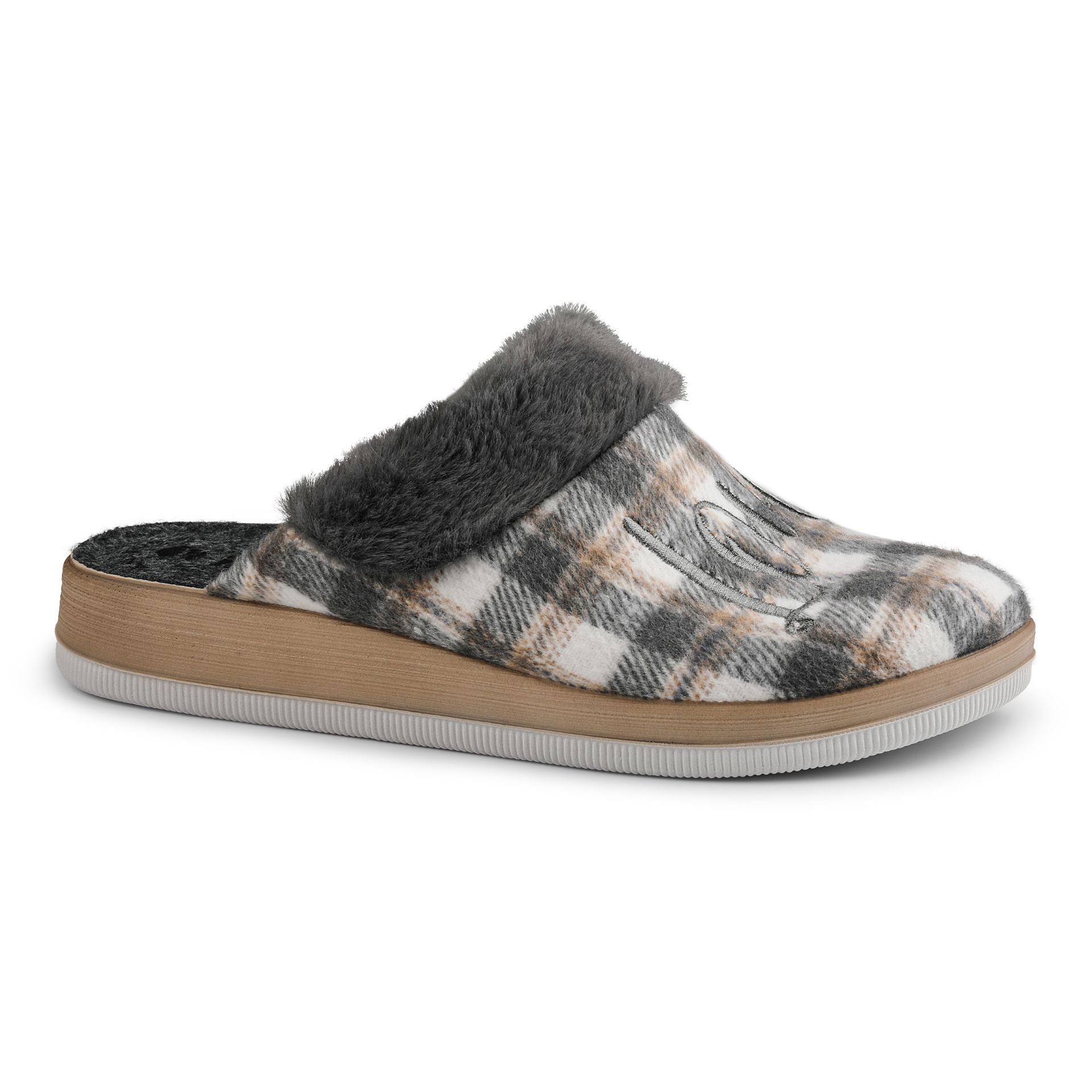Pantofole con scritta Love, bordo in ecopelliccia e maxi fantasia a losanghe colorata. Hanno plantare anatomico.