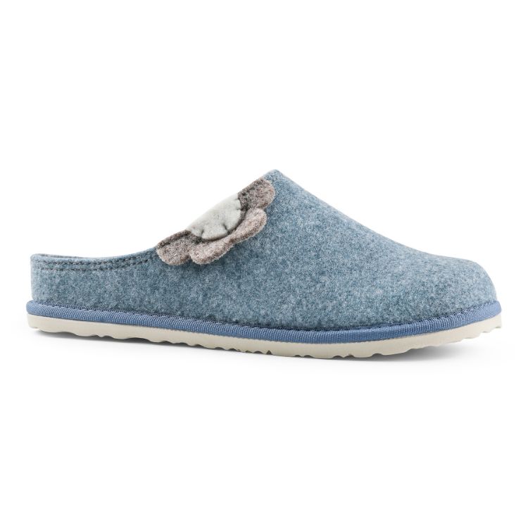 Nuove pantofole EcoFriends con allegra applicazione a fiore. Hanno un comodo sottopiede in pelle estraibile.