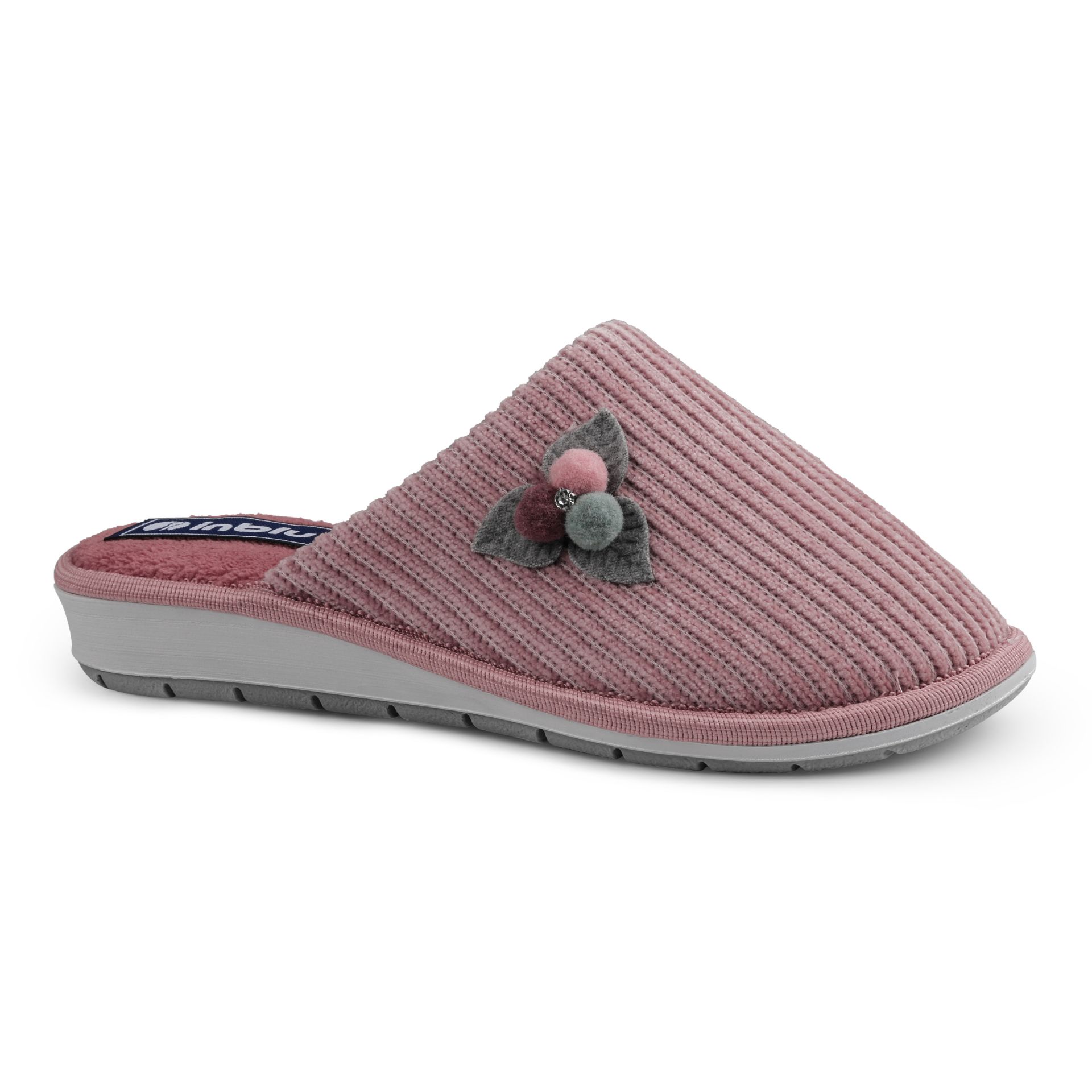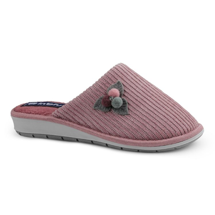 Pantofole a costine con originale applicazione ad aghifoglio colorato impreziosito da un brillantino. Hanno un morbido plantare imbottito.La suola, leggera e resistente, ha un tacco di tre centimetri.