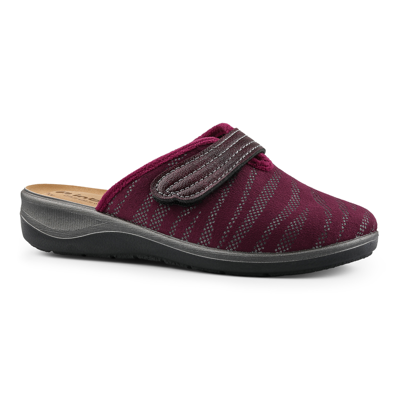 Tutta la praticità della chiusura a strappo unita ad un originale decoro a strass.Queste pantofole hanno un plantare in ecopelle imbottito e una suola leggera e flessibile.