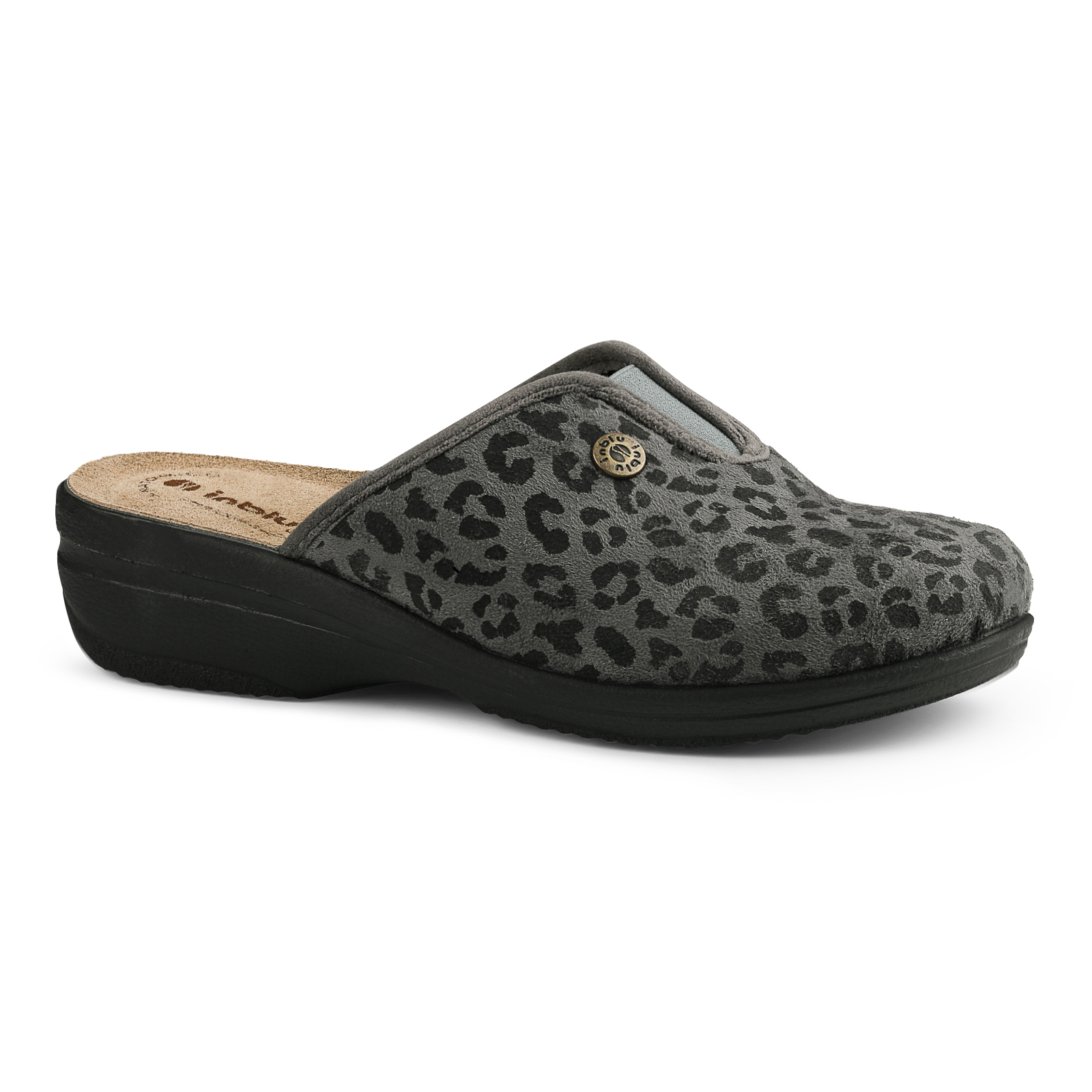 Pantofole con fantasia animalier ed elastico che le rende come su misura. Hanno un plantare in pelle imbottito.